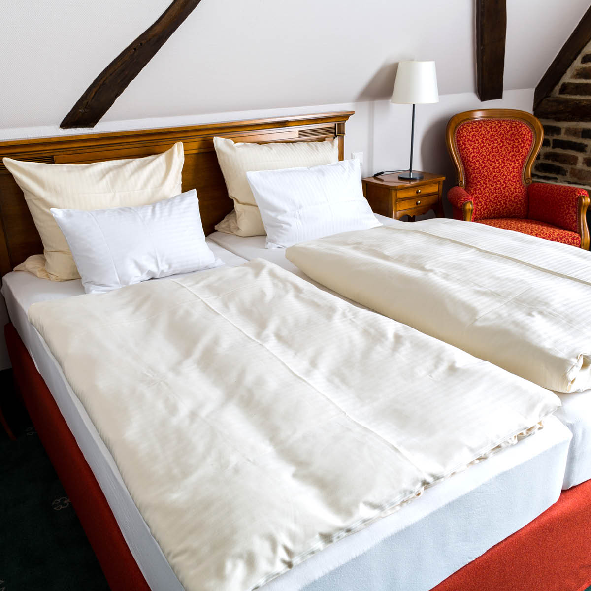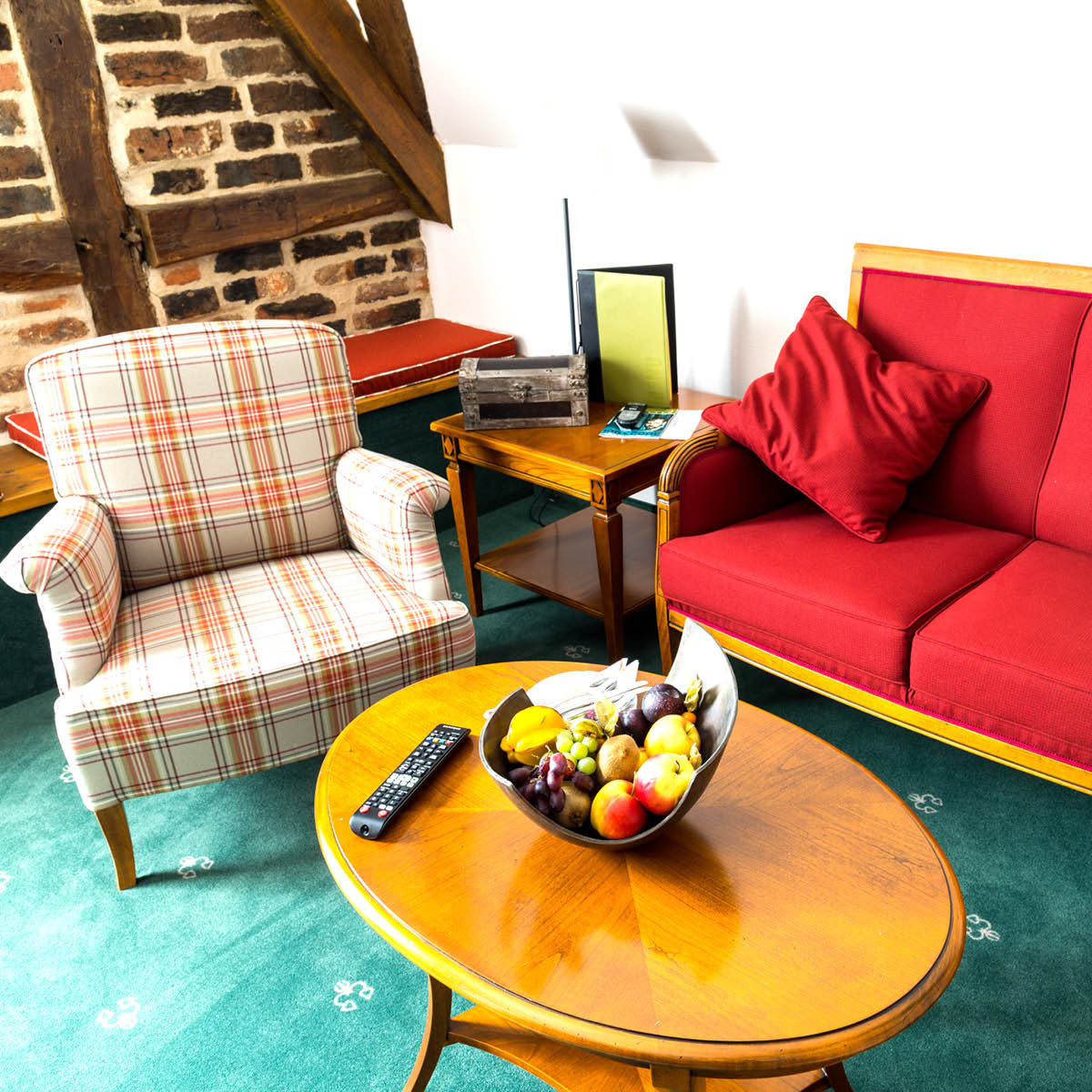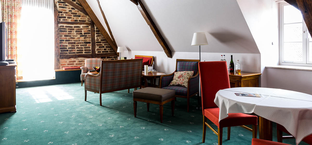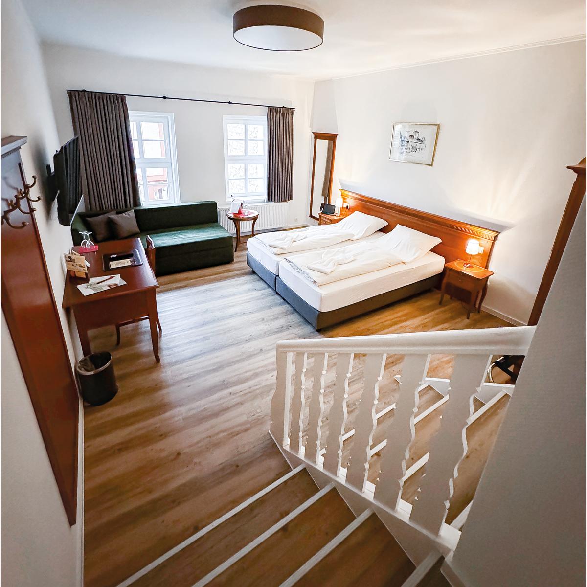 Unsere klimatisierten Maisonettezimmer bieten Ihnen über zwei Etagen Raum für einen entspannten Aufenthalt. Genießen Sie den Komfort und den weitläufigen Blick auf die historische Oberburg oder den Elmrand.