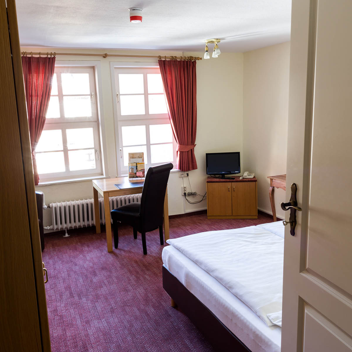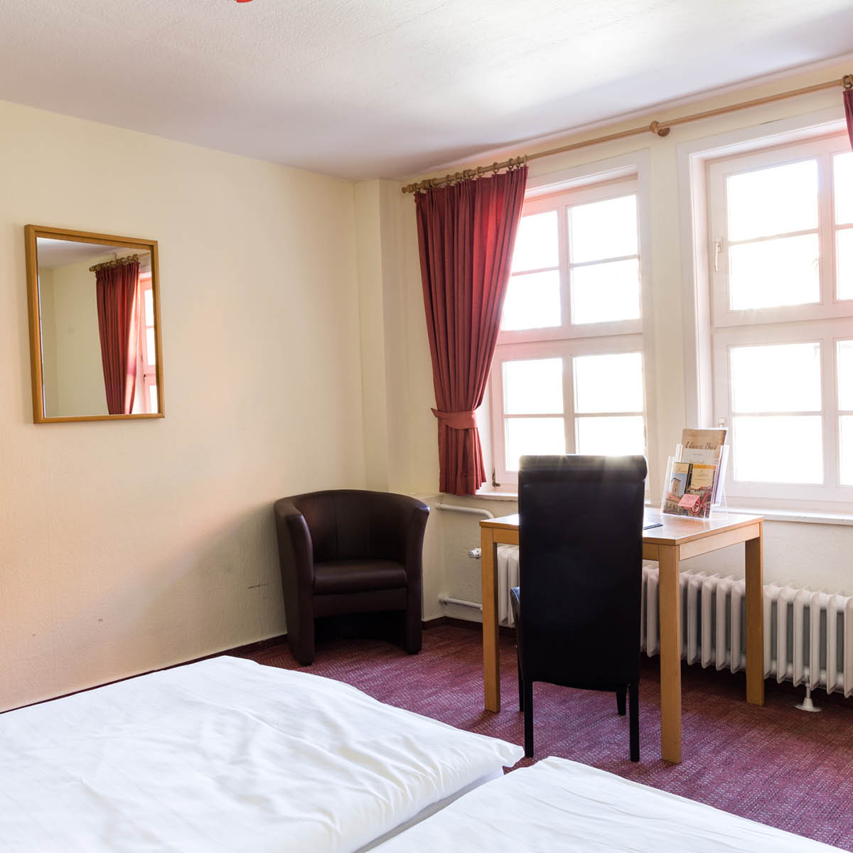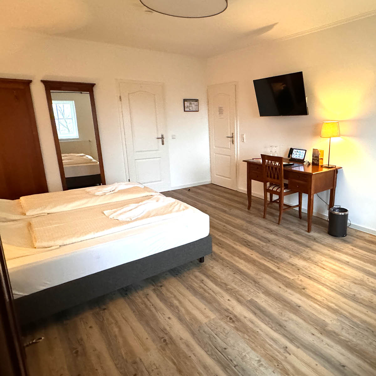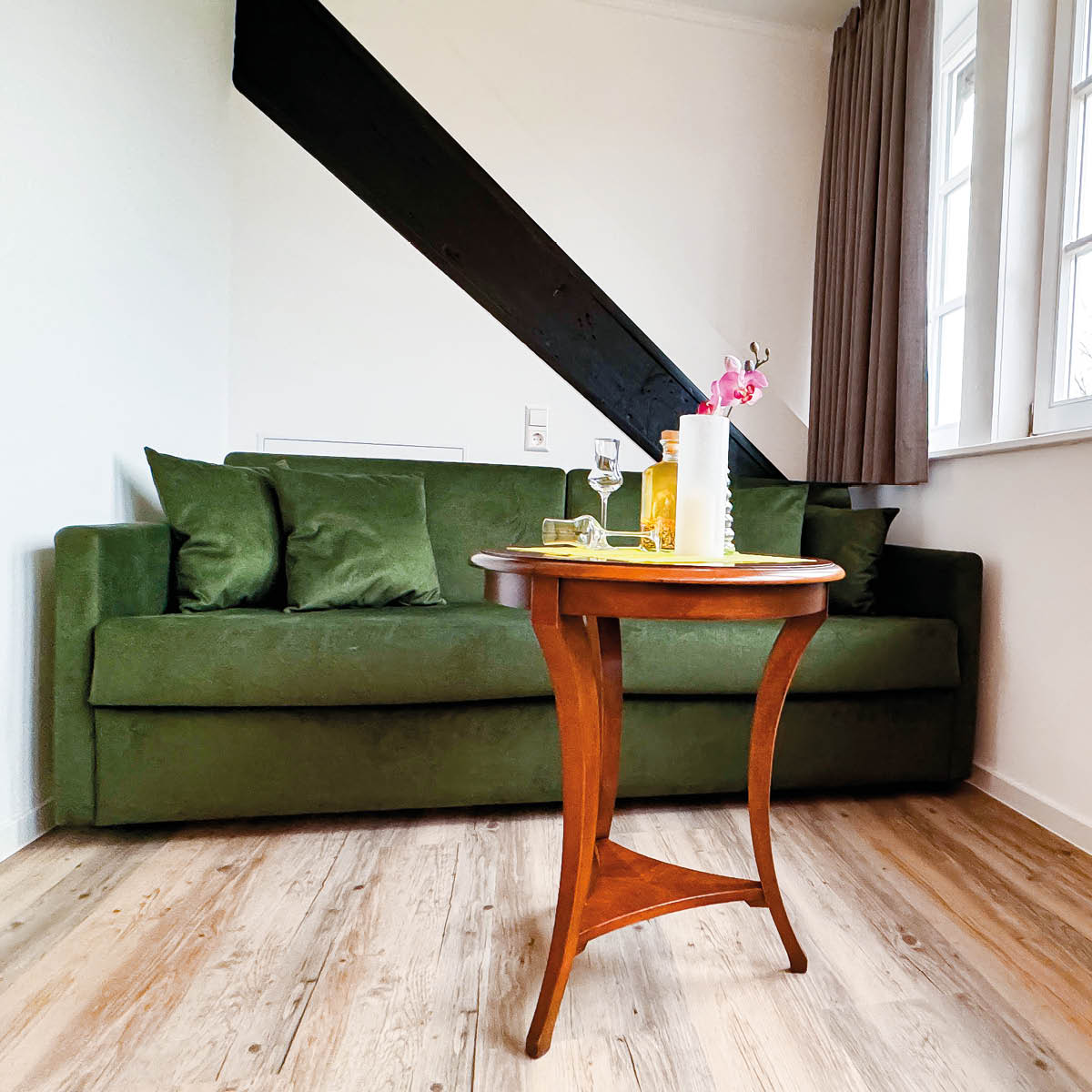 Unsere klimatisierten Maisonettezimmer bieten Ihnen über zwei Etagen Raum für einen entspannten Aufenthalt. Genießen Sie den Komfort und den weitläufigen Blick auf die historische Oberburg oder den Elmrand.