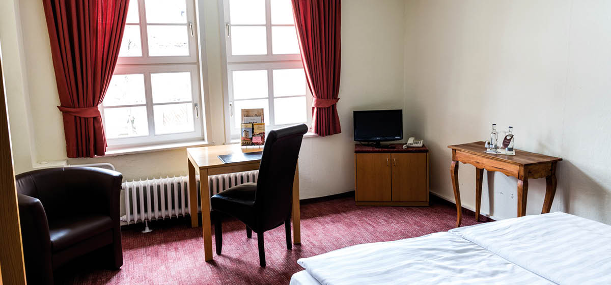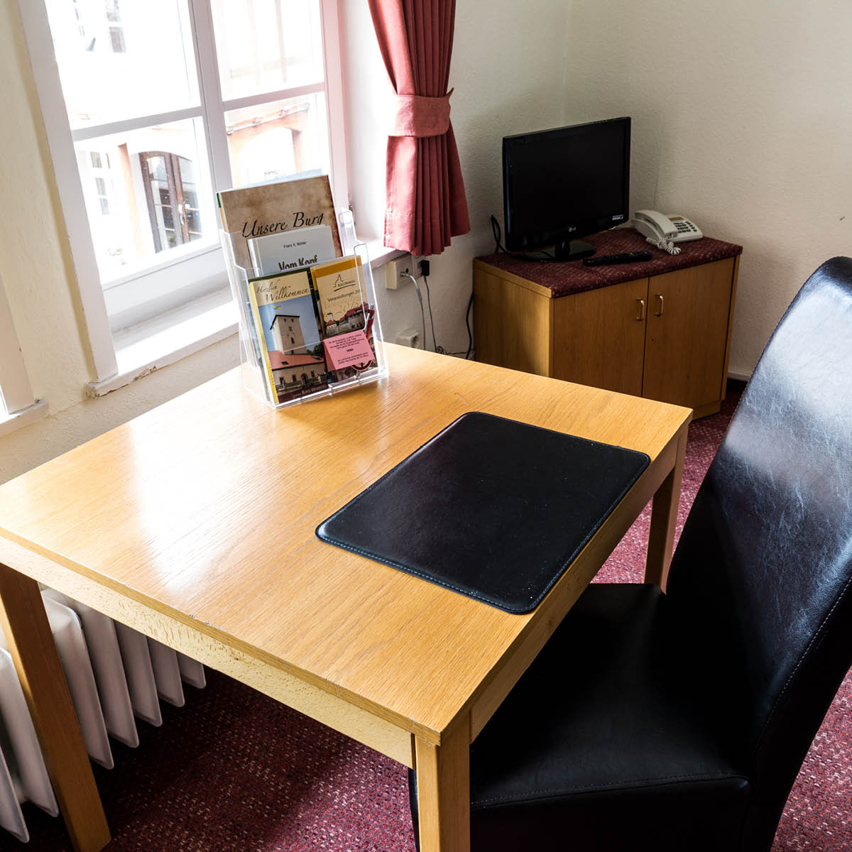 Genießen Sie unsere modernisierten Komfortzimmer mit Blick in den Burghof, über den Ort Warberg, auf den Gutshof oder die malerische Parkanlage der Burg.