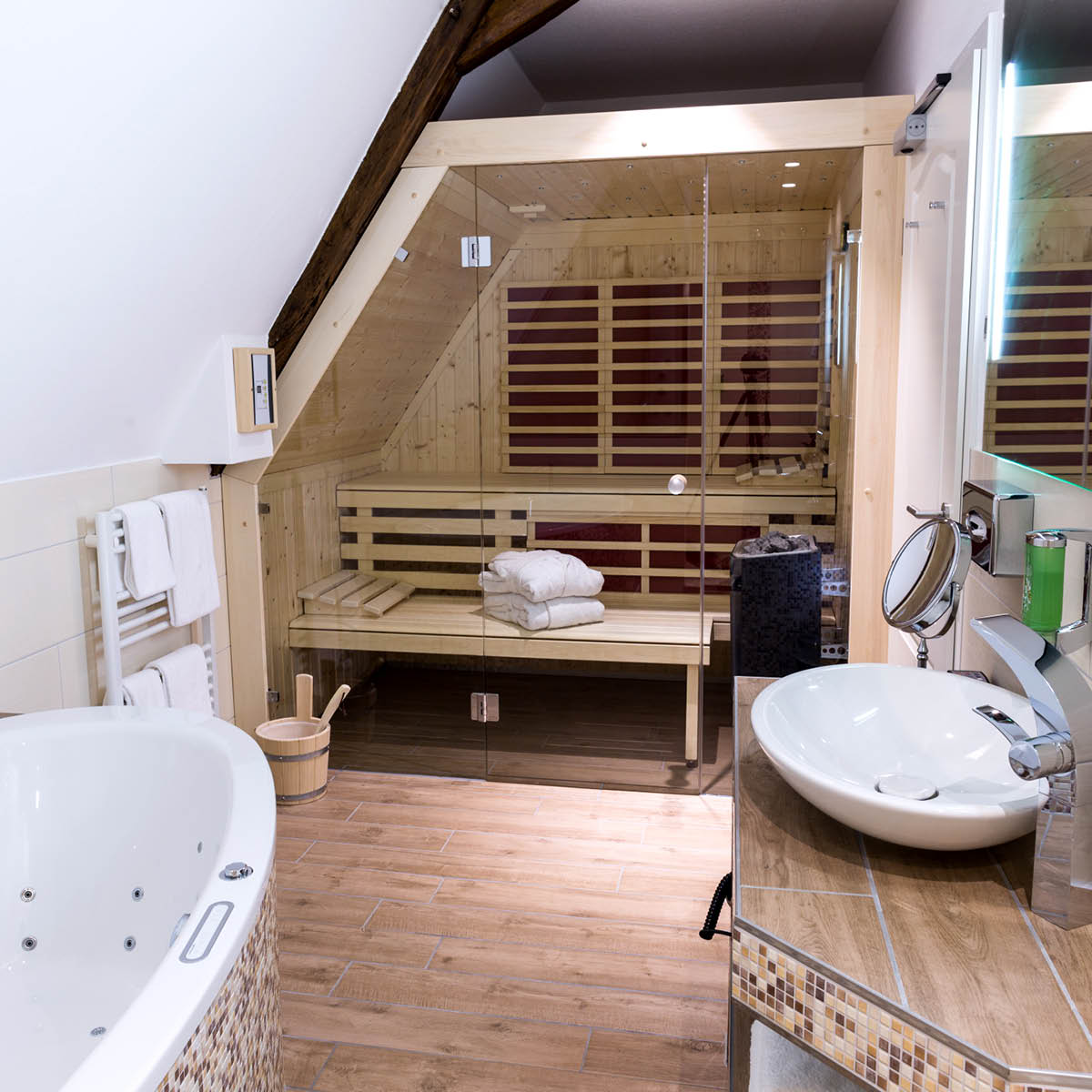 • Eigenes Duschbad mit Dusche / WC, Whirlpool, Infrarotkabine, Dampfsauna, Haartrockner und Handtücher