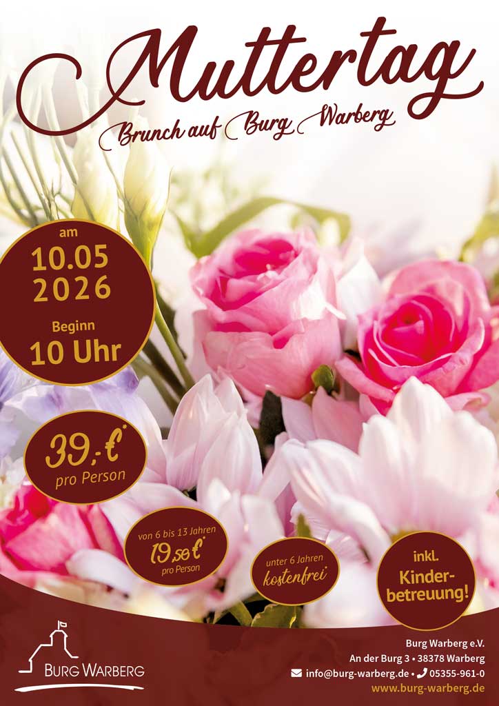 Genießen Sie einen unvergesslichen Muttertag in einzigartigem Ambiente: Auf der historischen Burg Warberg erwartet Sie ein liebevoll arrangierter Brunch, der keine Wünsche offenlässt. Verwöhnen Sie Ihre Mutter mit kulinarischen Köstlichkeiten, regionalen Spezialitäten und süßen Verführungen – begleitet von einer besonderen Atmosphäre voller Herzlichkeit und Genuss.